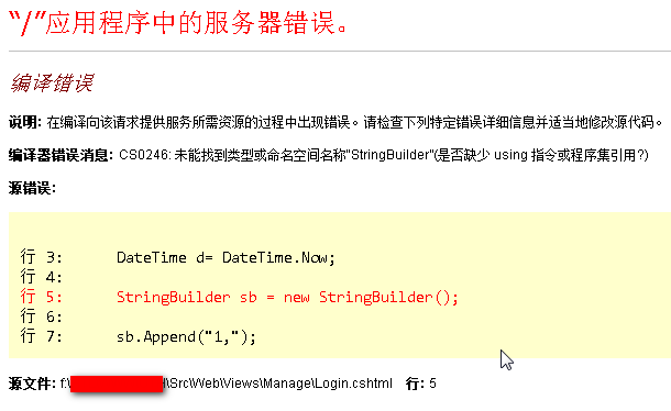 將views/Login.schtml內容清空并寫入以下內容,然后重新生成并在瀏覽器里查看,就會出現以下錯誤(原因是StringBuilder沒有引用命名空間System.Text)