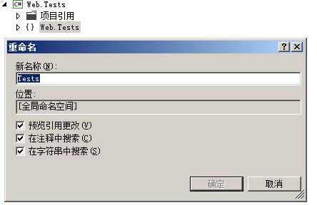 剛開始以后是項目的屬性中的命名空間沒有更改過來的問題,但我在重命名時更改的是全局的名稱,而且所有文件的命名空間都已經更改過來了