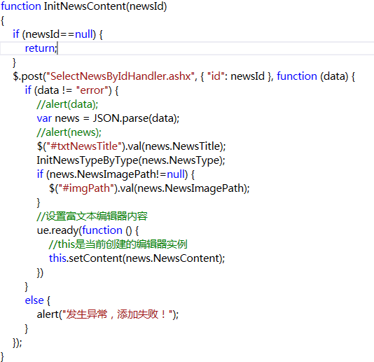 首先在頁(yè)面加載時(shí)獲取到新聞的id,然后再進(jìn)行ajax查詢,查詢新聞封裝在了一個(gè)handler中,向這個(gè)handler發(fā)起ajax請(qǐng)求,請(qǐng)求參數(shù)為新聞id,獲取新聞,獲取到之后,把新聞的內(nèi)容設(shè)置給ueditor