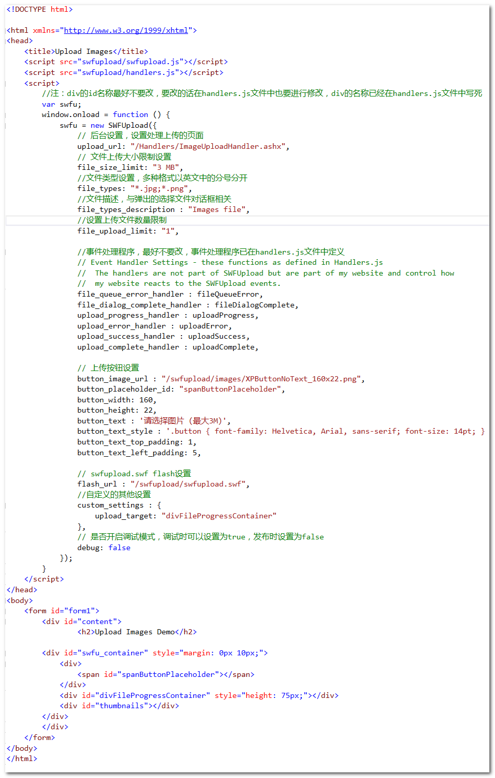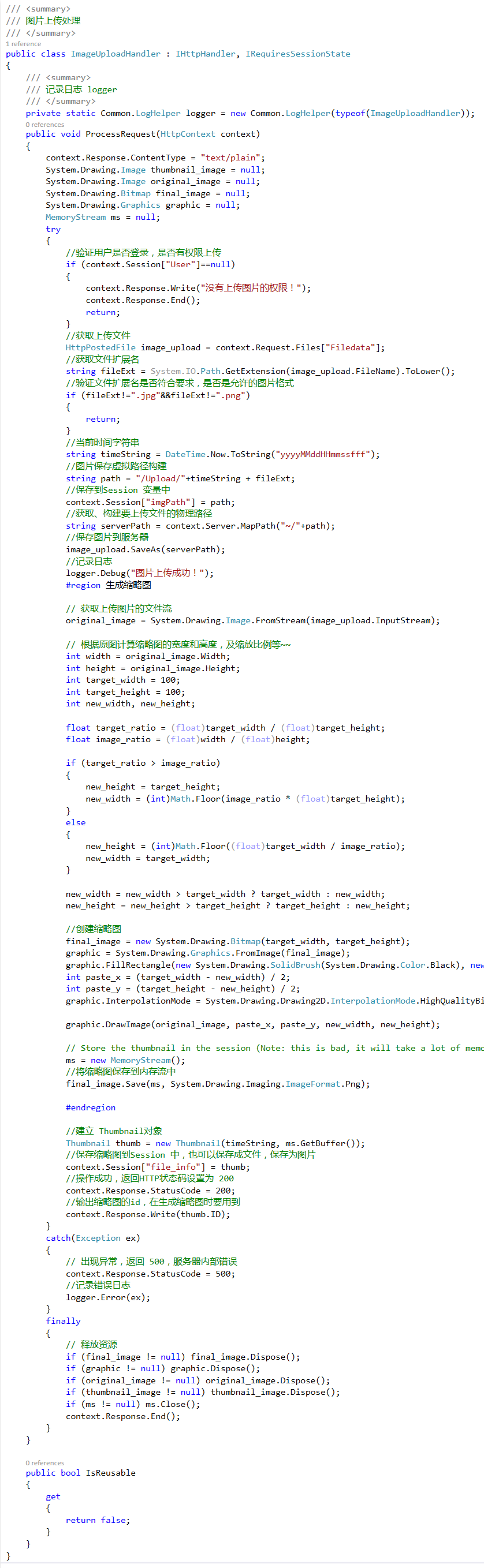 我的處理文件上傳的頁面是ImageUploadHandler.ashx,獲取縮略圖的頁面是GetThumbHandler.ashx,Thumbnail.cs是demo中App_Code文件夾中的文件,個人覺得像這種只處理邏輯功能而不展現頁面的最好都用一般處理程序來實現。由于哪個文件處理上傳哪個文件生成縮略圖已經在handlers.js文件中寫死了,所以必須要修改handlers.js文件以能夠使頁面正常運行
