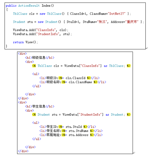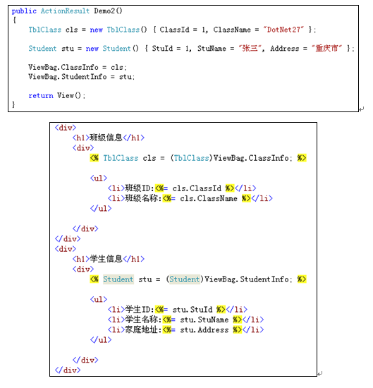 下面的代碼演示了向ViewBag中存放cls和stu兩個對象,這兩個對象分別放到了屬性ClassInfo和StudentInfo中。