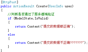 頁面中如果使用了MVC驗證功能,那么在后臺對應的Action中必須通過ModelState.IsValid判斷是否通過了服務器端驗證。只有通過了服務器端驗證,才能執行其他的業務邏輯代碼