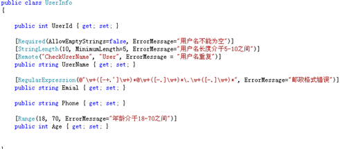 Required:非空驗證StringLength:驗證字符串的長度RegularExpression:正則表達式驗證Compare:比較兩個字段的值是否相等Range:范圍驗證Remote:服務器驗證(需要在controller中編寫返回值為JsonResult的Action)自定義驗證標記與驗證相關的js文件