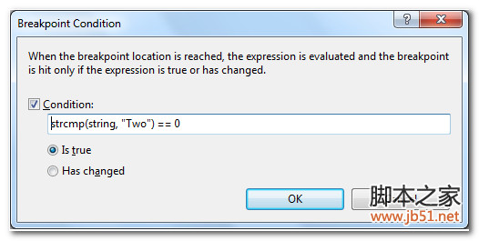 Visual Studio考慮到程序員經(jīng)常會根據(jù)字符串的內(nèi)容添加斷點,因此在添加斷點這個功能上為字符串做了特殊的支持。我們在根據(jù)字符串內(nèi)容添加斷點時,可以使用strcmp等函數(shù)來設(shè)置斷點。