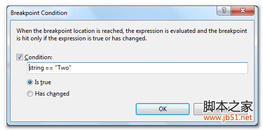 當(dāng)我們運行上述代碼時,會發(fā)現(xiàn)即使string的內(nèi)容”Two”時,運行并沒有中斷。這是因為==運算符比較的是兩個字符串的地址而不是內(nèi)容,因此上述斷點并不能滿足我們的需求。(字符串名就是地址)