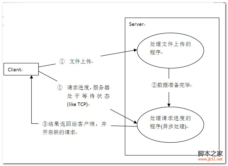要想得到處理過程中的值,我的解決是這樣,在文件上傳時(shí),要開啟另一個(gè)請求,來獲取進(jìn)度信息。而這個(gè)請求是異步的,我指的是客戶端異步請求和服 務(wù)端異步處理。因?yàn)橐婕暗絻蓚€(gè)不同的請求處理程序之間信息的傳遞,將"處理文件上傳的程序"得到的進(jìn)度信息傳遞給"處理進(jìn)度請求的程序",而"處理進(jìn)度 請求的處理程序"要依賴于"處理文件上傳的處理程序"。處理圖: