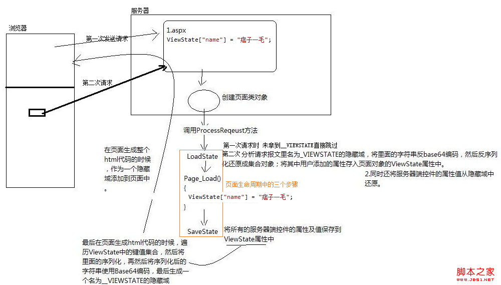 //在頁面類對象 執行PR方法的時候 先創建了控件樹 然后通過執行 loadState方法 將請求報文中的名字為__VIEWSTATE的值 然后反base64編碼 進行反序列化 最終還原成為集合 之后將其中屬于程序員自己添加到ViewStatue里的鍵值對【ViewState會自動添加頁面中runat=server控件的屬性與狀態】還原到頁面對象的ViewState屬性中 最后才執行Page_Load 原理 見圖