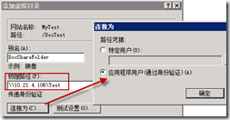3、在網(wǎng)站下添加一虛擬目錄,虛擬目錄的物理路徑執(zhí)行服務(wù)器A的共享目錄,路徑符合UNC規(guī)則,如\\ServerB\DocShare,傳遞身份驗證用戶設(shè)置為默認即可。