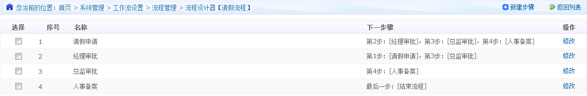 上圖是一個請假流程的全部步驟,下面介紹怎么制定這些步驟。