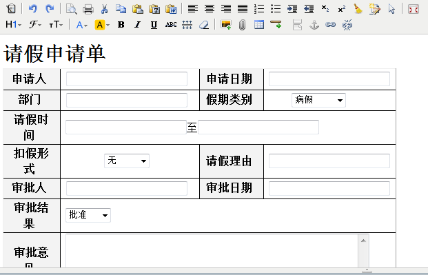 上圖的HTML是強制定義的,像table>tbody>tr>td必須按照這個格式定義,雖然不靈活,但是功能也算實現了。說說思路:這個表單將解析成11個節點(申請人、申請日期、部門、假期類別、請假時間、扣薪形式、請假理由、審批人、審批日期、審批結果、審批意見)