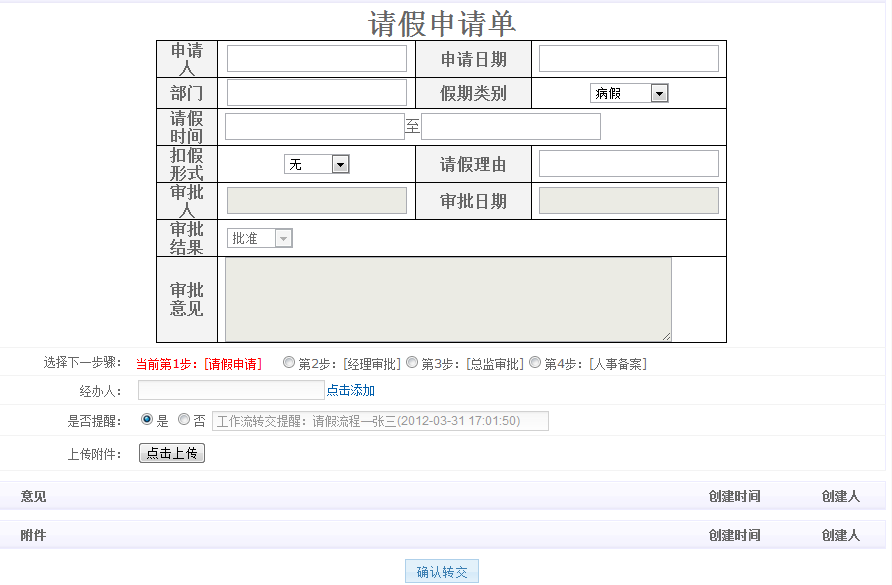 然后填寫表單內容,選擇下一個步驟及經辦人就可以流轉至下一步。說明:表單內容我是把整個表單的HTML代碼全部存入數據庫,然后流程流轉時再把填寫好的表單內容存入下一步,這樣流程到下一步時,看到的表單就是最新的了。這是一個很笨的辦法,因為使用$("#表單tableID")是獲取不到表單的value值的,所有需要進行處理,獲取表單內容通過jquery直接attr(value,文本值)上去,這樣就可以把表單內容存入數據庫。