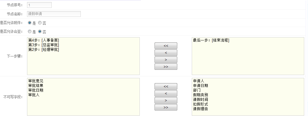 節點序號:用來表示當前流程為第幾步,節點名稱用來標識當前步驟名稱,是否允許附件、會簽,用來控制附件與會簽區的顯示和隱藏。下一步標識當前步驟可以流轉到哪些步驟,左邊是已經選擇好了的(可以是多個步驟,這里考慮的是,不同的職位使用相同的流程會有特殊情況發生,譬如正常的流程是需要四步[員工填寫》經理審批》總監審批》人事備案],但是當總監請假的時候就不需要這么多步驟[填寫表單》人事備案]),右邊是拉取當前流程下的所有步驟。不可寫字段標識,當前步驟時,表單有哪些節點為不可以填寫,譬如:員工填寫請假申請單,流轉到經理時,那么經理看到的表單就有員工姓名、部門等信息不能填寫,只能填寫審批意見等節點信息。這樣流程與表單就關聯好了,接下來就是工作流流轉了。