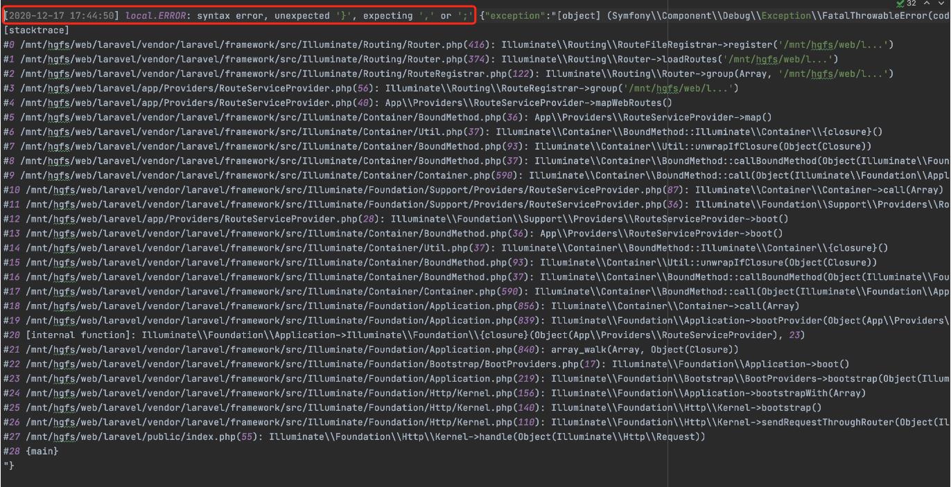 對于上面的修改做一下說明,laravel的$dontReport屬性的異常類都不會被上報,因為客戶端錯誤信息我們不需要記錄,所以將其添加到$dontReport屬性里,并且在render方法里把異常大概分為了兩大類,一大類就是客戶端異常,另一大類就是服務器異常,我們把服務器異常統一code為500,錯誤信息為服務器錯誤,將真實的錯誤信息記錄在了錯誤日志里,避免把服務器信息暴露給了客戶端。