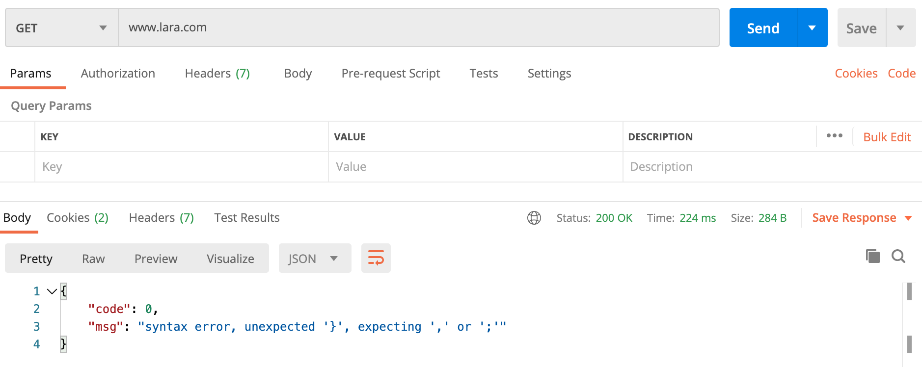 這樣我們就可以根據APP_DEBUG的值設置是否返回JSON格式的數據了,現在我們把.env的APP_DEBUG的值設為false來測試一下,然后我們故意把代碼寫錯,通過postman或瀏覽器來訪問接口