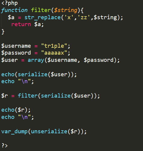 可以看到,這里過濾函數將原來的x換成了zz,但是長度卻超過了原來的長度 ,但是原來長度的數字時沒變的,這就導致報錯。但是試想一下,如果這里的密碼是可控的,然后我們輸入字符