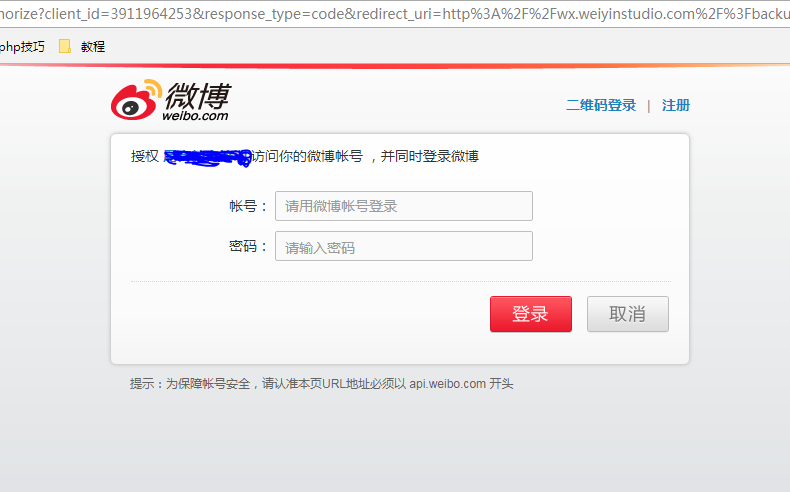 https://api.weibo.com/oauth2/authorize?client_id=YOUR_CLIENT_IDresponse_type=coderedirect_uri=YOUR_REGISTERED_REDIRECT_URI
