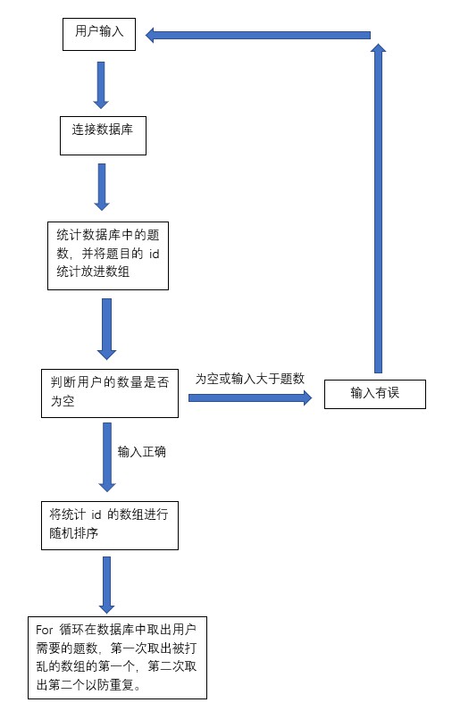 首先要實現這個功能,首先我需要三個頁面,一個是用戶輸入頁面input.html,一個是后臺處理頁面select.php,還有一個是錯誤警告頁面error.html(如果用戶輸入為空,或者輸入的抽題數量超過了題庫的數量那么就報錯),然后是數據庫,數據庫分為兩列,一列是question,用來存放題目,另一列是id,用于標識question。