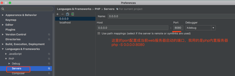 配置如下: [xdebug] zend_extension="/usr/local/opt/php70-xdebug/xdebug.so" xdebug.remote_enable = On xdebug.remote_handler = dbgp xdebug.remote_host= localhost xdebug.remote_port = 9001 #這個端口不要被占用即可,可以自行指定 xdebug.idekey = PHPSTORM xdebug.remote_autostart=1 xdebug.remote_log=/var/tmp/xdebug.log