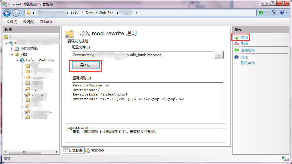 選中URL Rewrite功能,在右側(cè)找到【導(dǎo)入規(guī)則..】功能,并點(diǎn)擊。