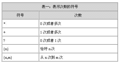 表一顯示了表示匹配次數的符號,這些符號用來確定緊靠該符號左邊的符號出現的次數: