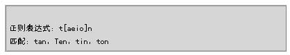 為了解決句點符號匹配范圍過于廣泛這一問題,你可以在方括號(“[]”)里面指定看來有意義的字符。此時,只有方括號里面指定的字符才參與匹配。也就是說,正則表達式“t[aeio]n”只匹配“tan”、“Ten”、“tin”和“ton”。但“Toon”不匹配,因為在方括號之內你只能匹配單個字符: