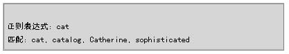 我們先從簡單的開始。假設你要搜索一個包含字符“cat”的字符串,搜索用的正則表達式就是“cat”。如果搜索對大小寫不敏感,單詞“catalog”、“Catherine”、“sophisticated”都可以匹配。也就是說: