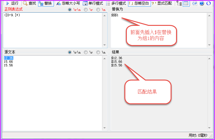 $$匹配元素是在匹配的內(nèi)容插入一個“$”字符,其實個人感覺兩個$$就像當于是轉(zhuǎn)意字符的意思。將元字符$變成普通字符。下面有一個需求就是我們匹配一串浮點數(shù)字,將浮點數(shù)字轉(zhuǎn)換為貨幣。例如錢數(shù)為12.36,15.66,15.56這個正則表達式還算簡單的,也就是([0-9.]+),先來看以下匹配的內(nèi)容,如下圖所示: