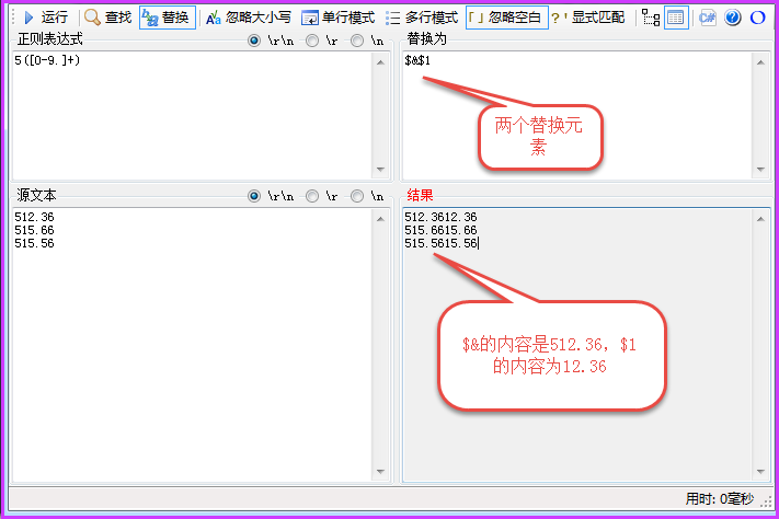 $表示的含義就是整個正則表達式的匹配的內(nèi)容也就是第0組里面的內(nèi)容。可以將上述的正表達式進行改造一下,在前面加一個數(shù)字5。正則表達式就變成了這樣5([0-9.]+),那么原文本前面也加一個5這樣就不會變太多。匹配結(jié)果如下所示: