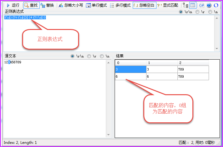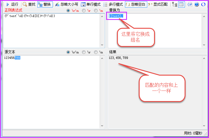 將上面正則表達式變換一下就好了,給第一個組分配一個組號,這樣整個正則表達式就變成這個樣子:(?'test'\d)(?=(\d{3})+(?!\d)),這是后替換的原則就變成這個樣子,詳情請見下圖,原理都是一樣的。