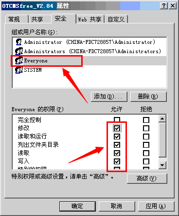 打開辦法是:打開我的電腦,然后點菜單上的“文件夾選項”--->查看,然后把“使用簡單文件夾共享(推薦)”前面的鉤去掉,然后點“確認”;接下來回到需要打開權限的文件夾(數據庫存放的文件夾),右鍵---> 屬性--->安全,然后點“添加”--->"高級"--->立即查找--->然后在下面的地方選擇“everyone”--->確定--->點剛才加入的"everyone",然后在下面的大框編輯everyone