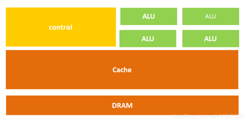 因?yàn)镃PU的架構(gòu)中需要大量的空間去放置存儲(chǔ)單元(橙色部分)和控制單元(黃色部分),相比之下計(jì)算單元(綠色部分)只占據(jù)了很小的一部分,所以它在大規(guī)模并行計(jì)算能力上極受限制,而更擅長于邏輯控制。