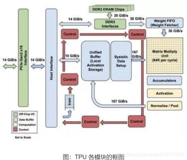 這表示谷歌充分意識(shí)到了片外內(nèi)存訪問是GPU能效比低的罪魁禍?zhǔn)祝虼瞬幌С杀镜脑谛酒戏帕司薮蟮膬?nèi)存。相比之下,英偉達(dá)同時(shí)期的K80只有8MB的片上內(nèi)存,因此需要不斷地去訪問片外DRAM。
