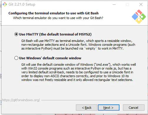 選項一,Git Bash將使用MinTTY作為終端模擬器,該模擬器具有可調整大小的窗口,非矩形選區和Unicode字體