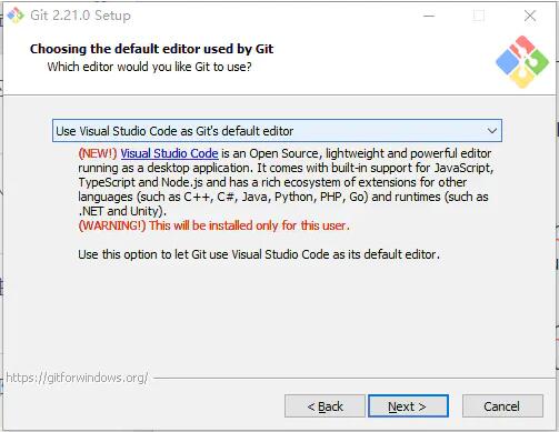 第四步:選擇默認編輯器,我日常使用Vscode作為編輯器,勾選使用 Visual Studio Code 作為 Git 的默認編輯器,點擊[next]