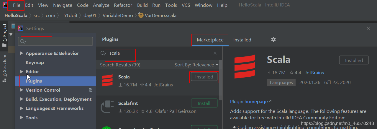 file ->Settings ->Plugins -> Marketplace ->搜索scala ->Installed下載 ->重啟IDEA