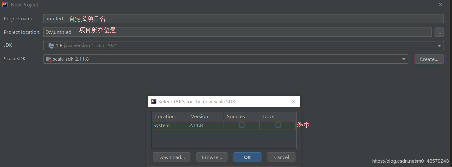 注意:一般點擊Create之后會自動檢索Scala SDK , 如果沒有自動檢索,點擊下面的Browse 手動將之前解壓的Scala文件夾選中 點擊ok即可