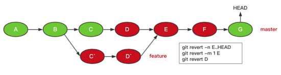回滾 G,通過 git 引一步一步回滾 F-F'-E‘-D'-C‘-E'‘(不滾)-D'‘(不滾)-C'‘(不滾) ,回滾 E+D 【推薦】回滾 G,回滾 F 丟棄 F',回滾 D+E,復原 C‘'..E‘' 比第一種方案更快更簡單,不用處理第一種方案中的 conflict