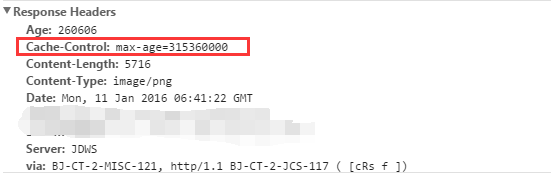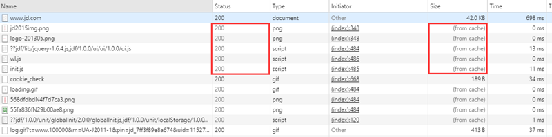 當瀏覽器對某個資源的請求命中了強緩存時,返回的http狀態為200,在chrome的開發者工具的network里面size會顯示為from cache,比如京東的首頁里就有很多靜態資源配置了強緩存,用chrome打開幾次,再用f12查看network,可以看到有不少請求就是從緩存中加載的: