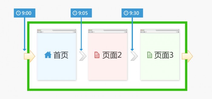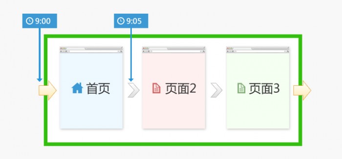 有人訪問了你的網站主頁,你的網站分析工具則開始為這個訪問者計1個Session(會話)。接著這個訪問者又瀏覽了另外兩個頁面,然后離開了你的網站(離開網站可以是通過關閉瀏覽器,或在地址欄鍵入一個不同的網址,或是點擊了你網站上鏈接到其他網站的鏈接……)為了簡單點,我們把這個過程當做一個Session。