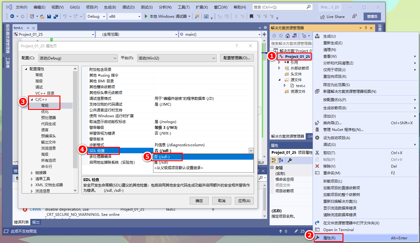 關(guān)閉步驟:右鍵“項(xiàng)目文件” —— “屬性” —— “配置屬性” ——“C/C++”——“常規(guī)”——“SDL檢查”改為“否”即可,如圖所示