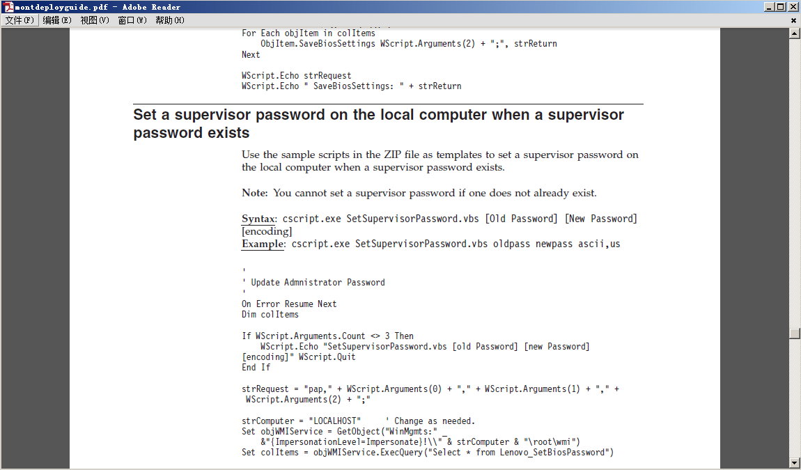 ' Execute the method and obtain the return status. ' The OutParameters object in objOutParams ' is created by the provider. Set objOutParams = objWMIService.ExecMethod("Lenovo_SetBiosPassword.InstanceName='ACPI\PNP0C14\1_0'", "SetBiosPassword", objInParam)