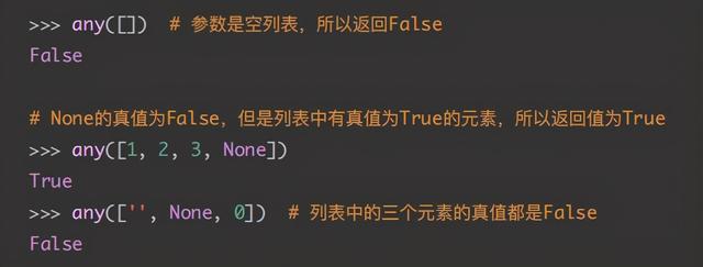 和all()函數相對應,如可迭代對象所有元素中只要有一個元素真值為True,那么就返回True,如果這個可迭代對象是空的,則返回True。它等價于: