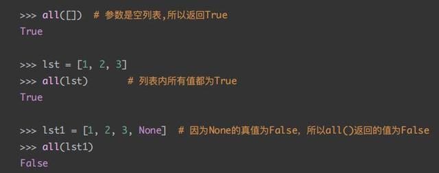 參數為一個可迭代對象,如果該可迭代對象所有元素的真值都為True(或者可迭代對象為空),則返回True。它等價于: