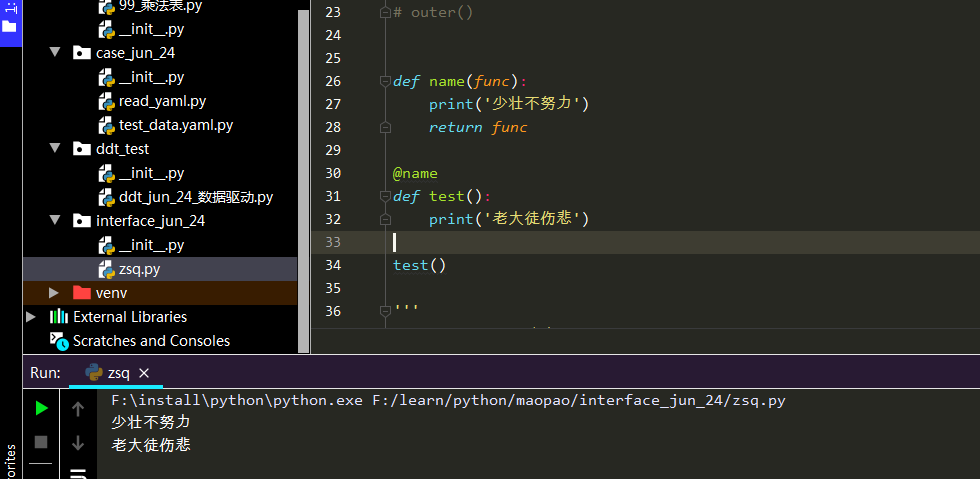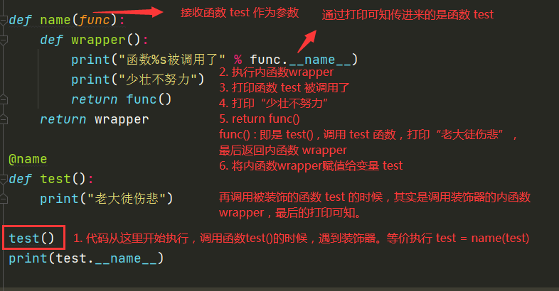想要實現一個功能,在不改變 test 函數內部結構的前提下,在前面加一句 “少壯不努力”