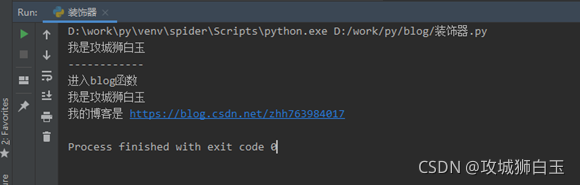 最近有人問我裝飾器是什么,我就跟他說,其實就是裝飾器就是類似于女孩子的發卡。你喜歡的一個女孩子,她可以有很多個發卡,而當她戴上不同的發卡,她的頭頂上就是裝飾了不同的發卡。但是你喜歡的女孩子還是你喜歡的女孩子。如果還覺得不理解的話,裝飾器就是咱們的手機殼,你盡管套上了手機殼,但并不影響你的手機功能,可你的手機還是該可以給你玩,該打電話打電話,該玩游戲玩游戲,該收藏攻城獅白玉的博客就收藏攻城獅白玉的博客。而你的手機就變成了帶手機殼的手機。