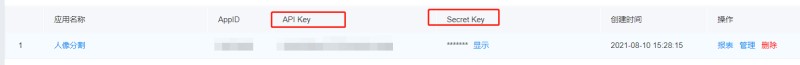 這里面我們可以創建一個人像分割的應用,其中的API Key及Secret Key后面我們調用人臉識別檢測接口時會用到。