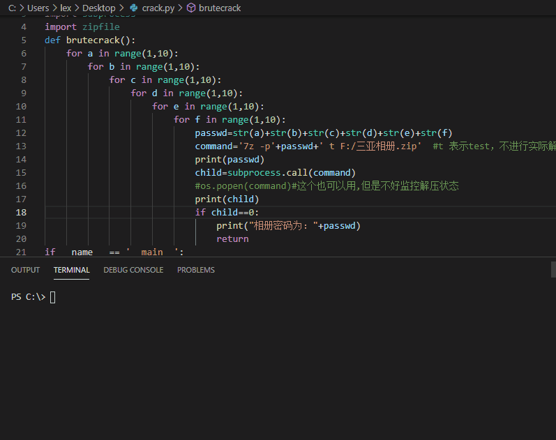 首先如果想要python命令行來打開小姐姐相冊,那么首先要找到嘗試打開的命令行,即解壓縮時使用的命令行。然后我們使用python腳本寫嵌套循環(huán),不斷的對zip文件進行嘗試解壓,然后找回真實的密碼。