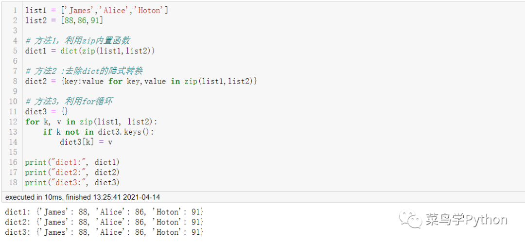 將兩個列表轉換為字典,常見的情況是一個列表作為鍵,另一個列表作為值來構造字典。
