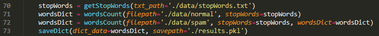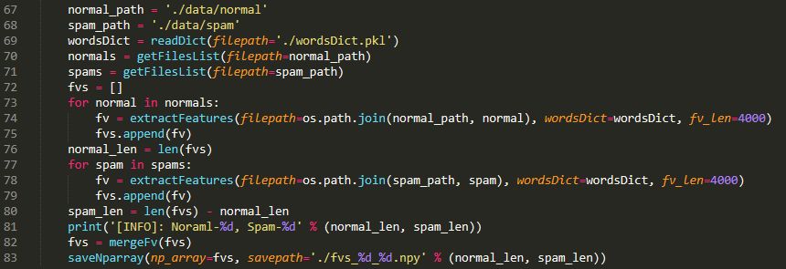 最終結果保存在**“fvs_%d_%d.npy”**文件內,其中第一個格式符代表正常郵件的數量,第二個格式符代表垃圾郵件的數量。