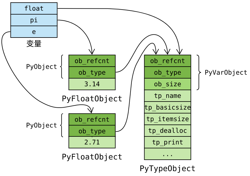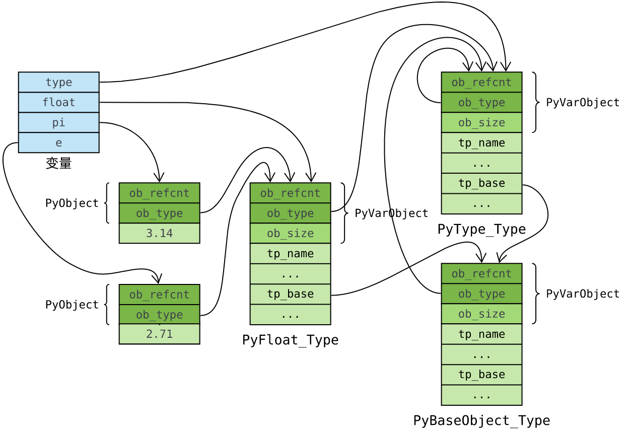 由此,得到了實(shí)例對(duì)象和類(lèi)型對(duì)象在內(nèi)存中完整的關(guān)系圖。以float為例,
